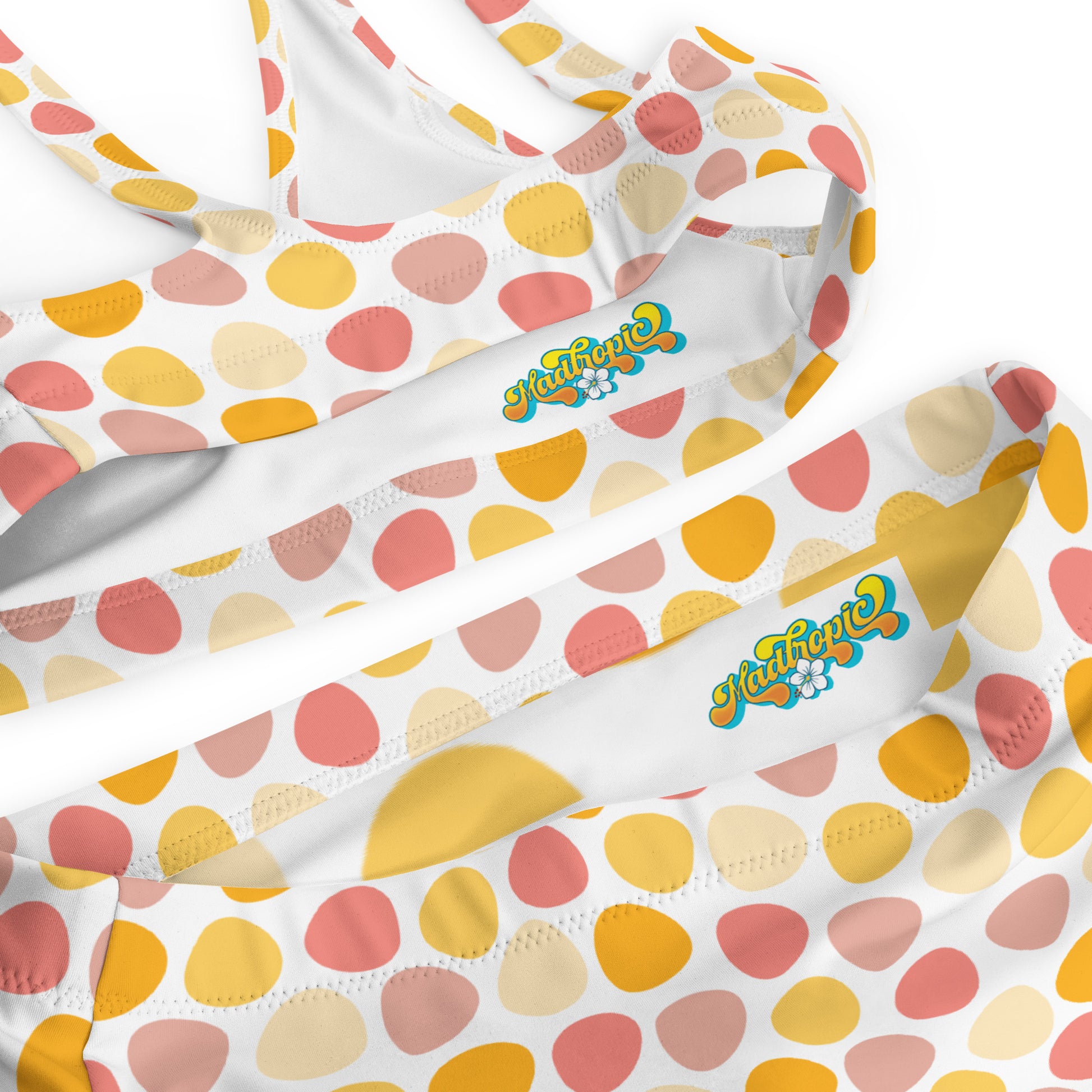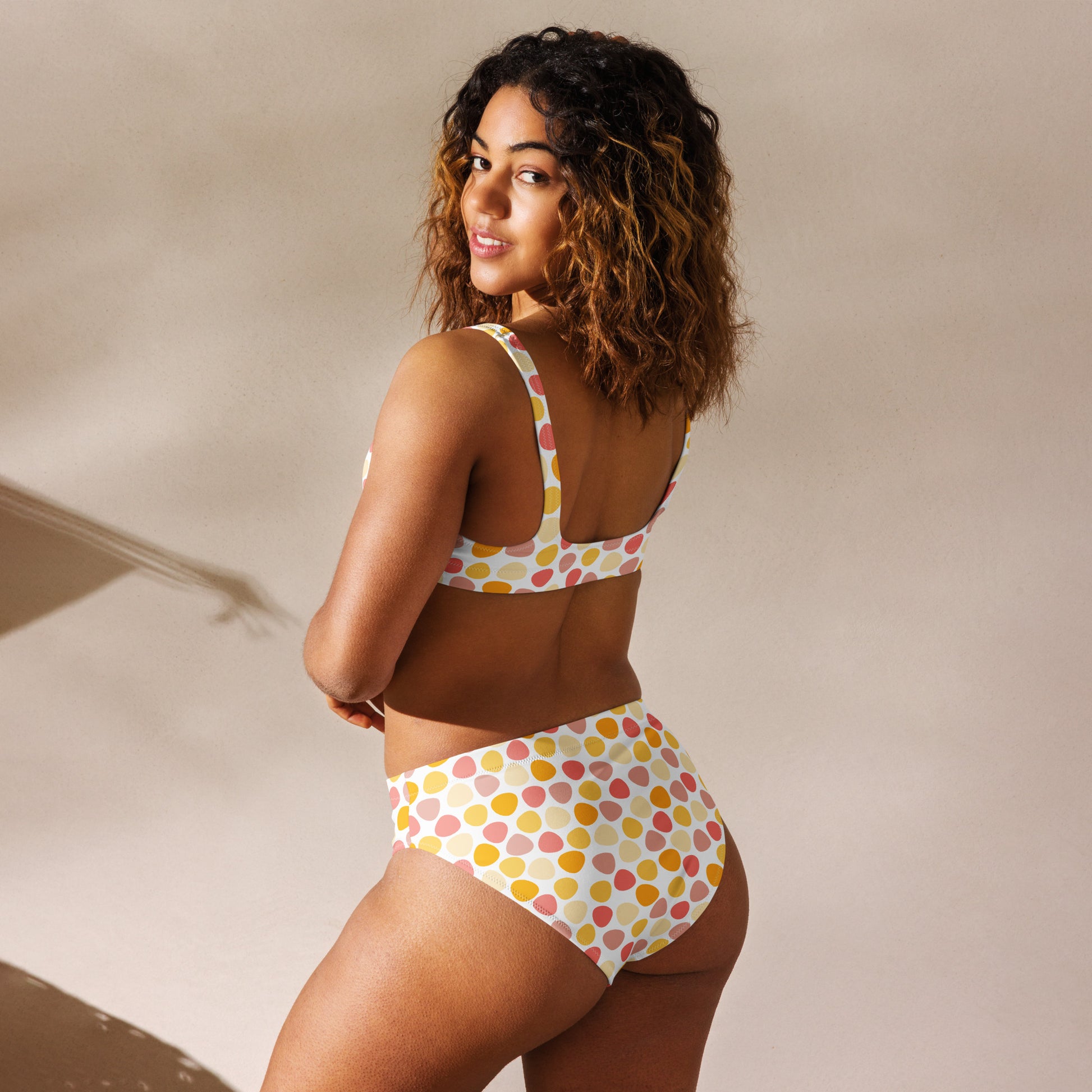 Constructed from recycled materials, this luxe high-waisted bikini features a subtly striking pebble-patterned fabric in a captivating coral hue. Perfect for lounging at the beach or pool, this bikini exudes effortless elegance and timeless sophistication. Removable pads and its double-layer make it comfy to wear all day.