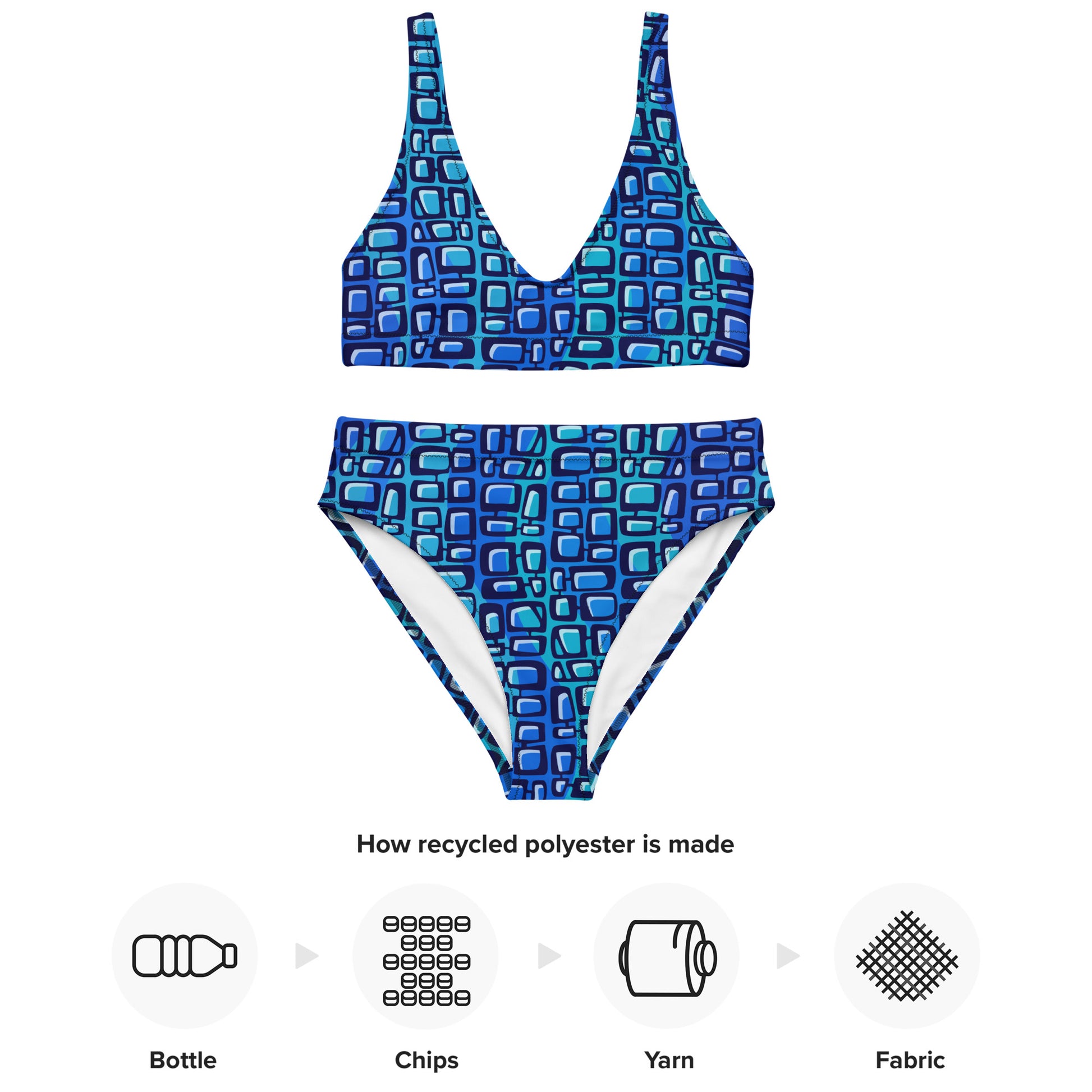 The Deep Tiki Wave Recycled high-waisted bikini is surf-ready style that takes the plunge! The blue-tiki goodness will have you catching waves, not just looks. Dive headlong into ocean-inspired fashion that's as good for the environment as it is for your summer wardrobe! Removable pads and its double-layer make it comfy to wear all day by the pool or at the beach.