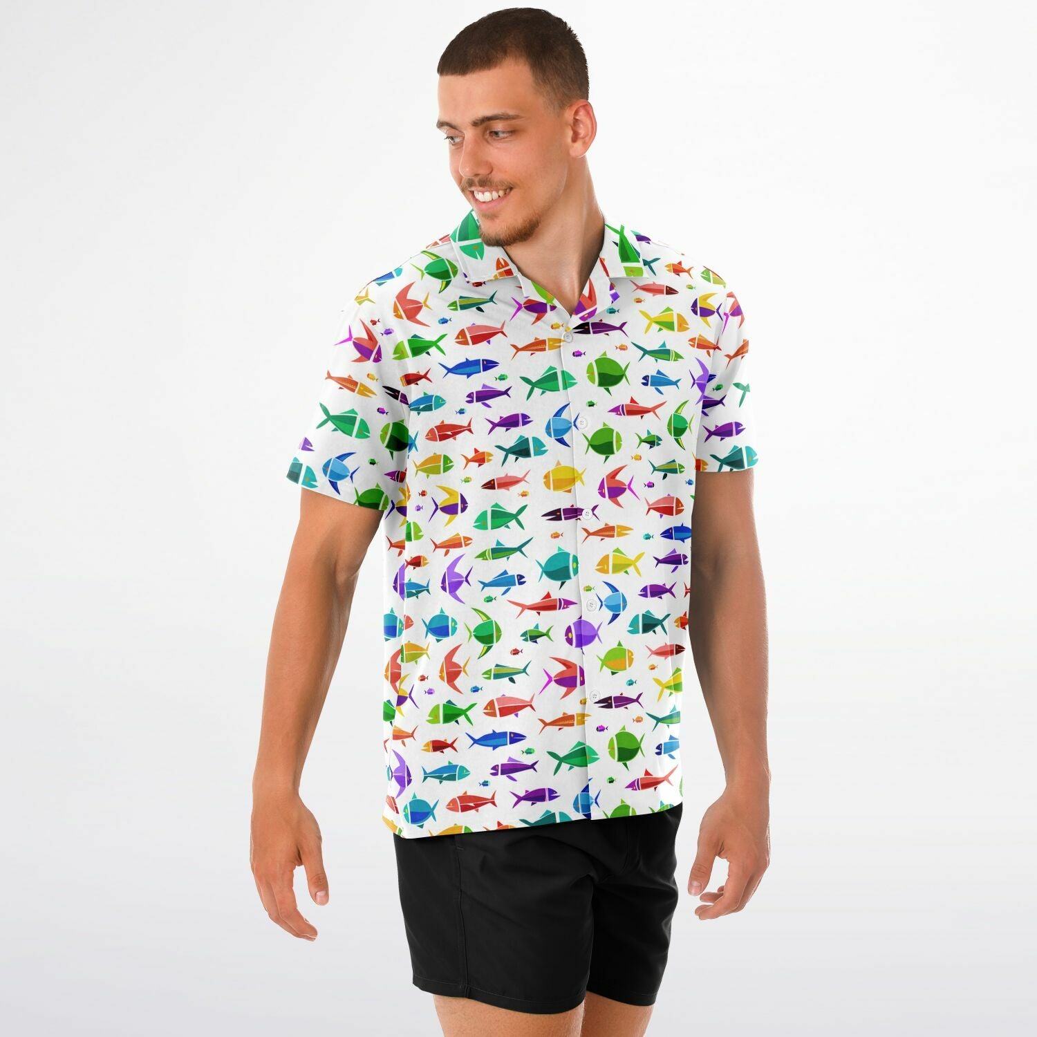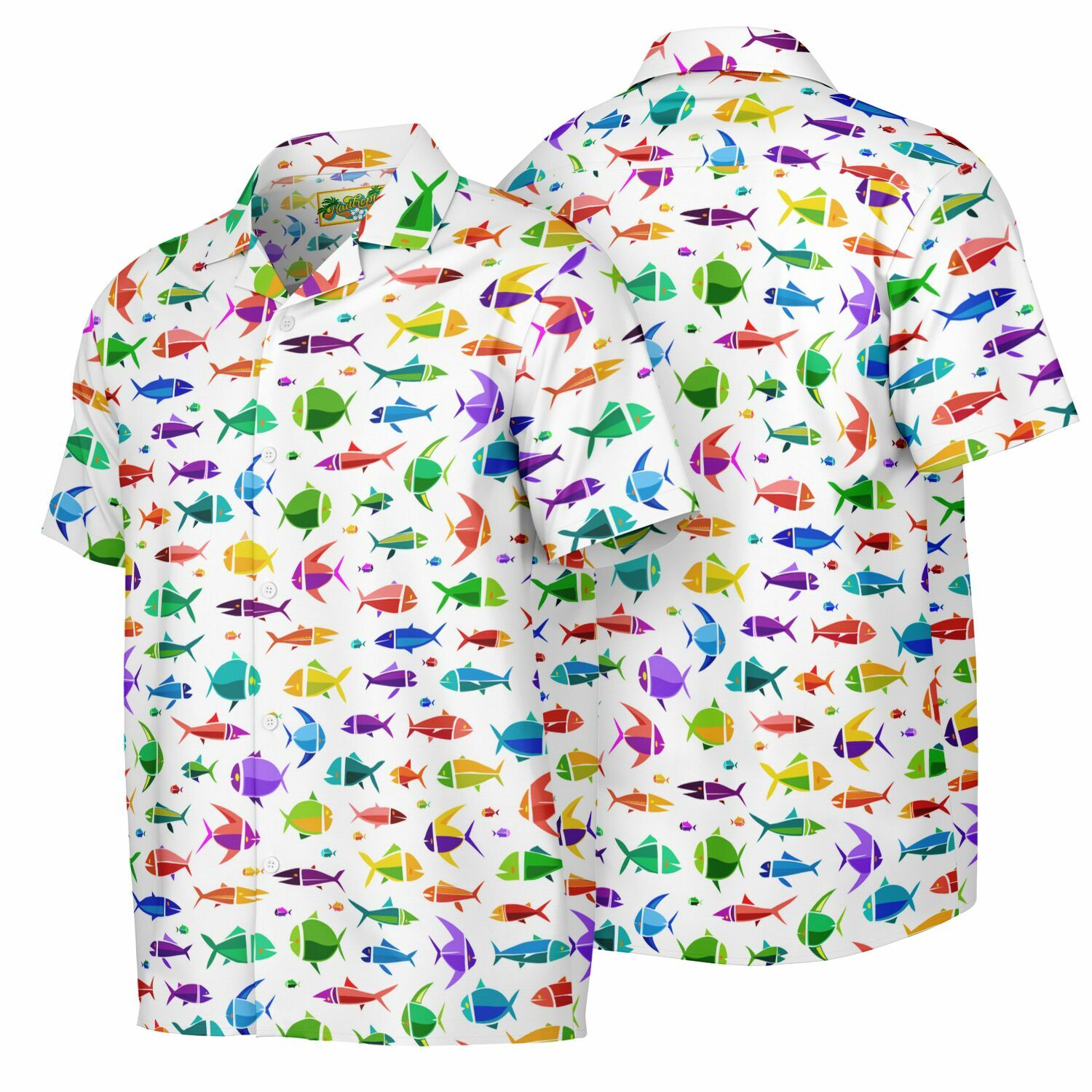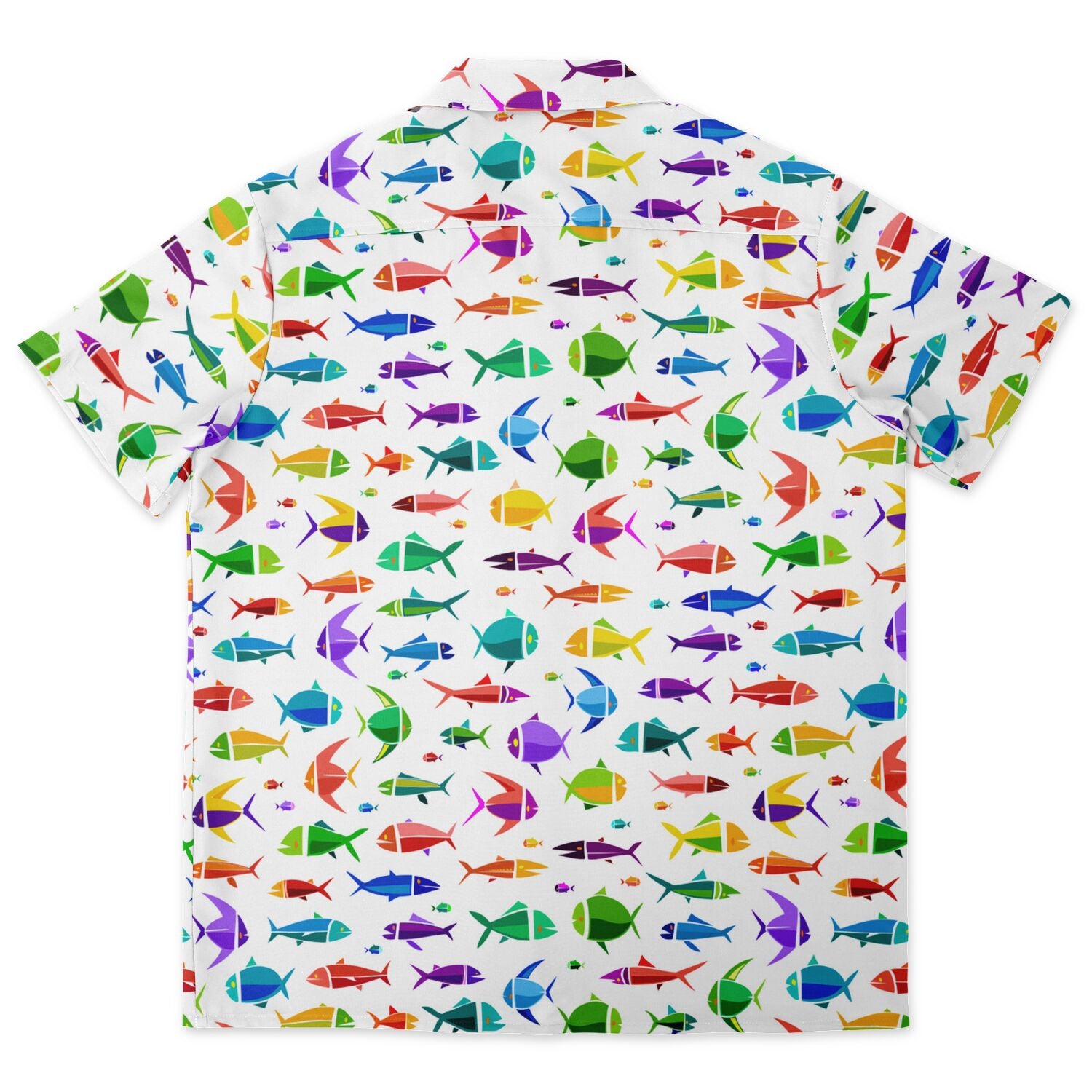 Make a splash with the 'Fishies' shirt! Showcasing the ocean's vibrant creatures, this colorful button-down is perfect for any sea lover. Embrace the bounty of the sea in style with this quirky, playful shirt. (No reef necessary.)