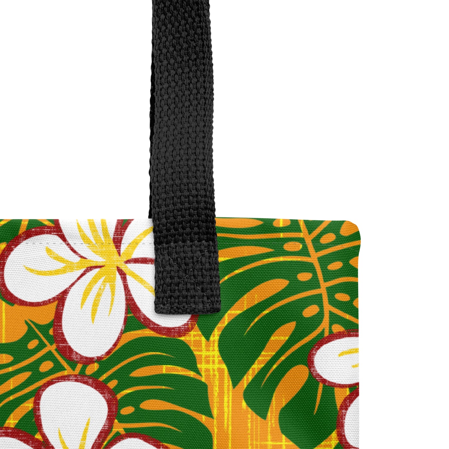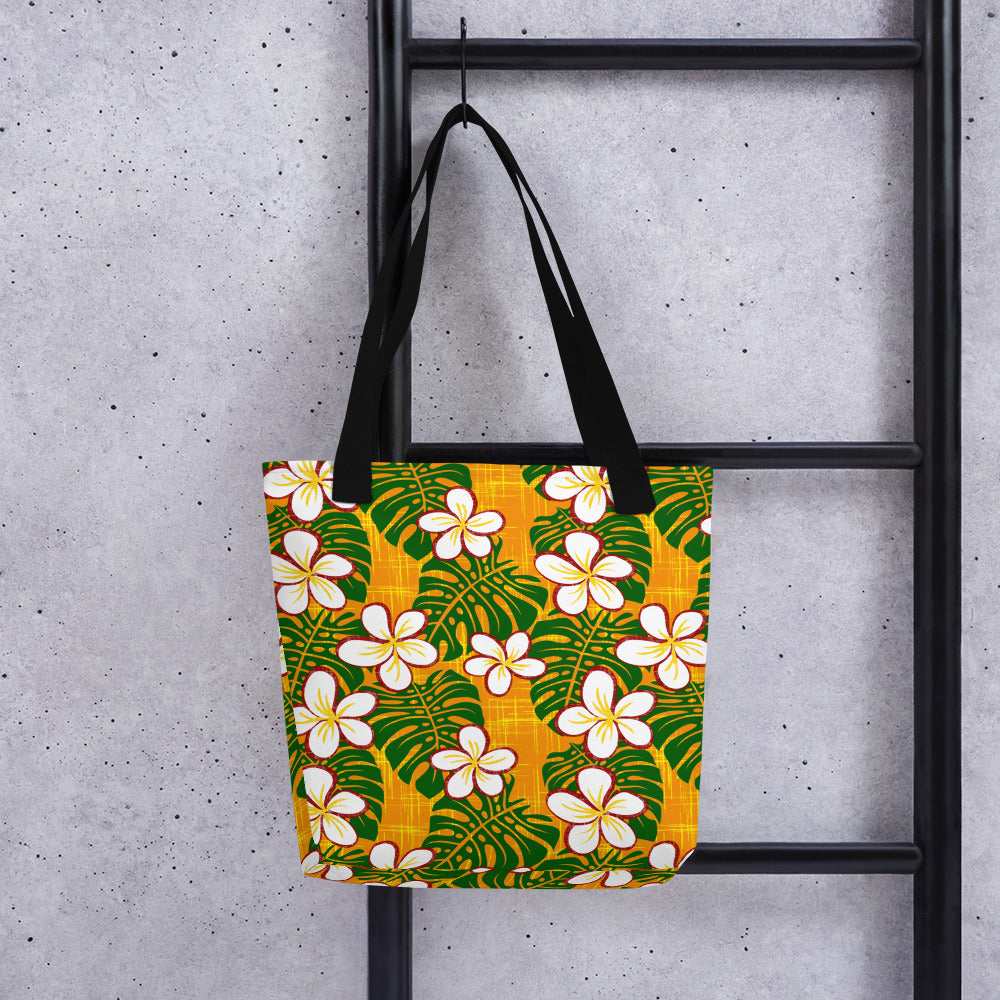 Discover the perfect accessory for your autumn wardrobe with the Oahu Autumn Tote Bag. Crafted with beautiful fall colors and tropical foliage, this bag is sure to be an eye-catcher. Experience island-style vibes wherever you go and make a statement with your style.