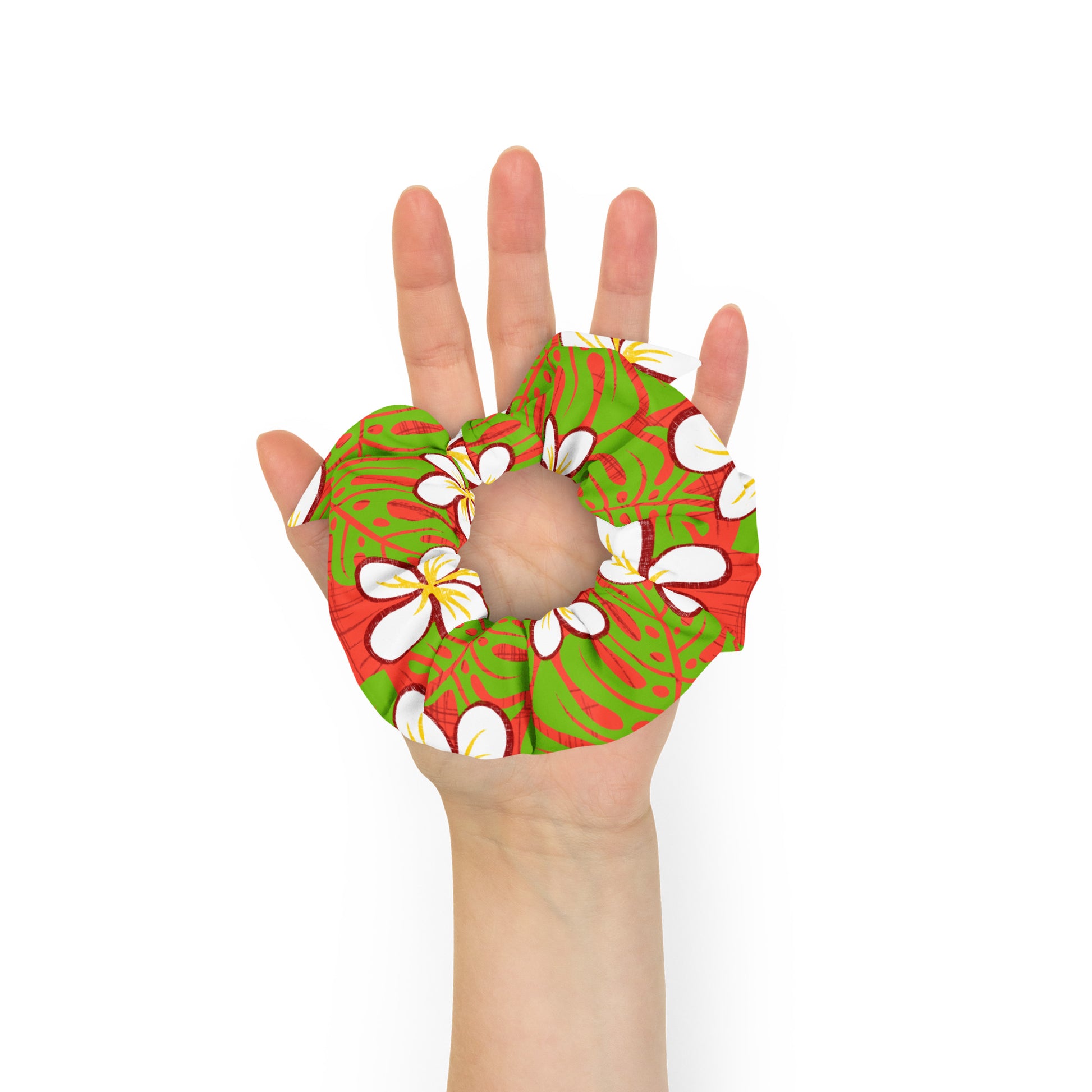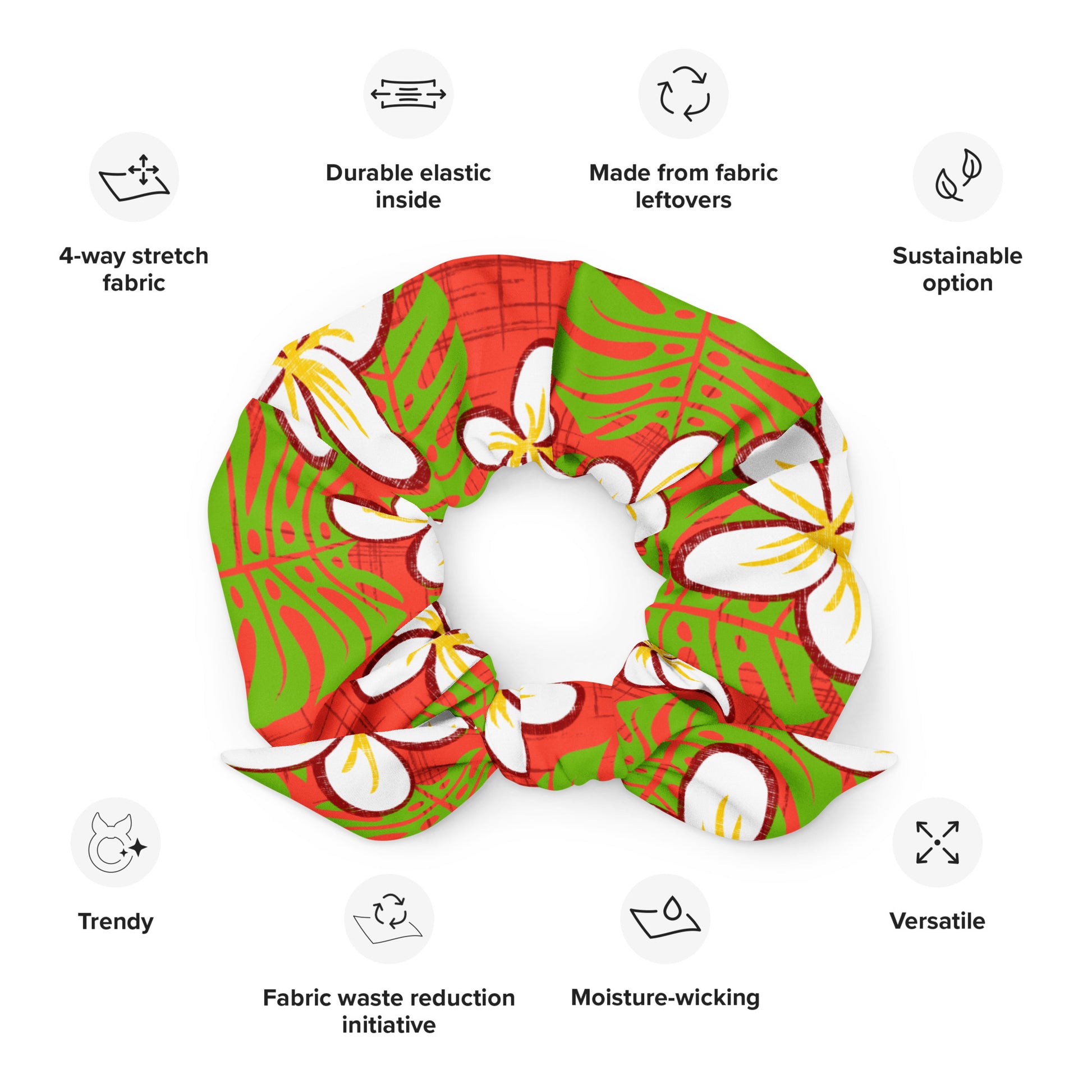 Greet the holidays in the perfect Hawaiian way: with our Kalikimaka Recycled Scrunchie! This scrunchie is handmade with love and Aloha, featuring vibrant red and green colors with a special Plumeria twist. Get ready to rumble the waves of style and joy this festive season!