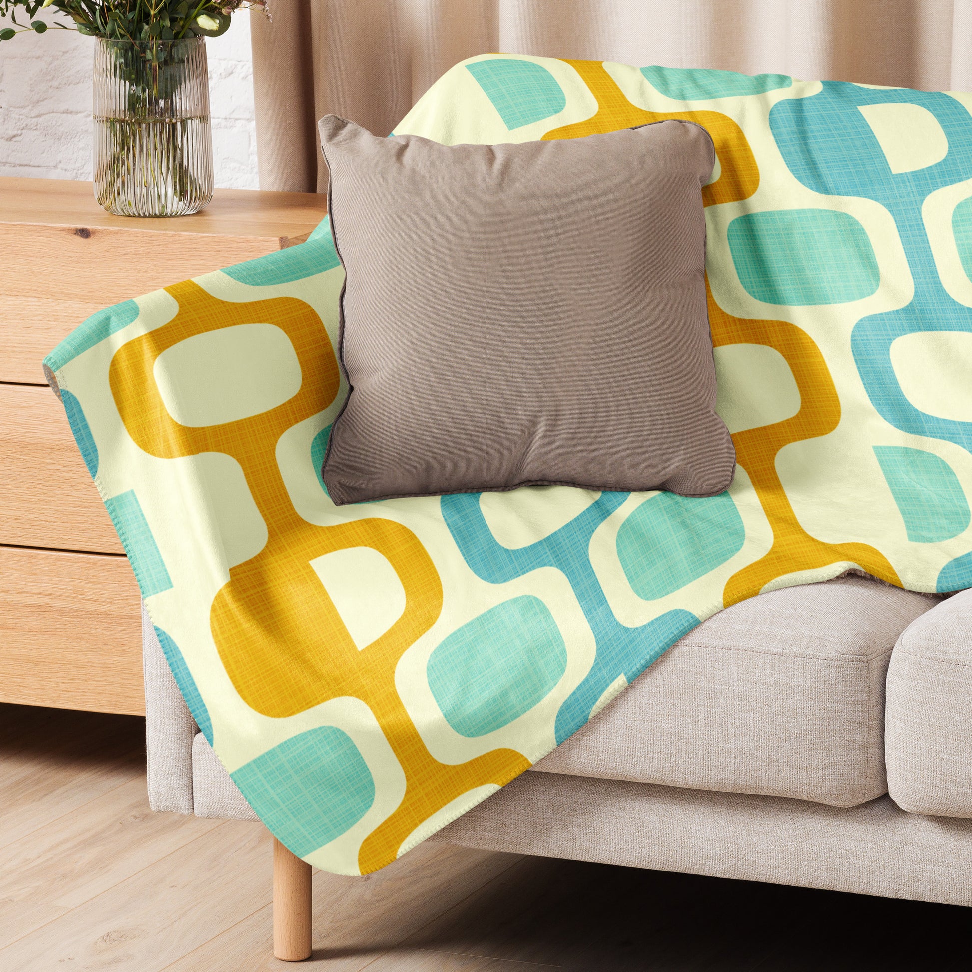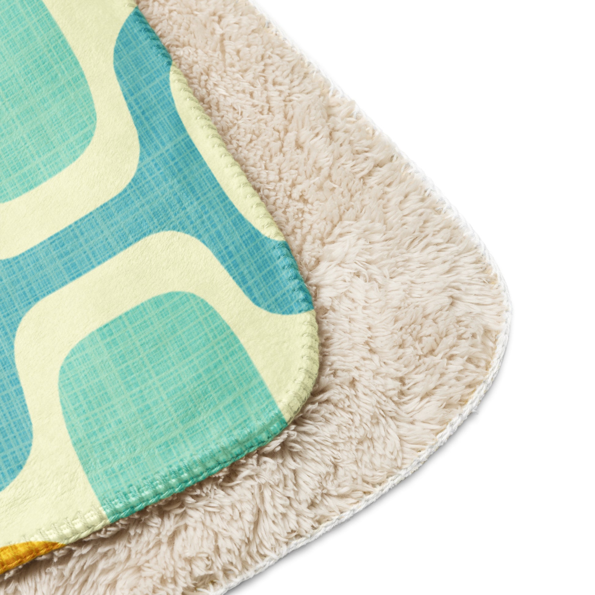Dive into midcentury modern style with the Marigold Lagoon Sherpa blanket. Enjoy a cool and tranquil palette of tropical colors while being enveloped in its comfortable sherpa fabric. Enjoy a cozy night in!