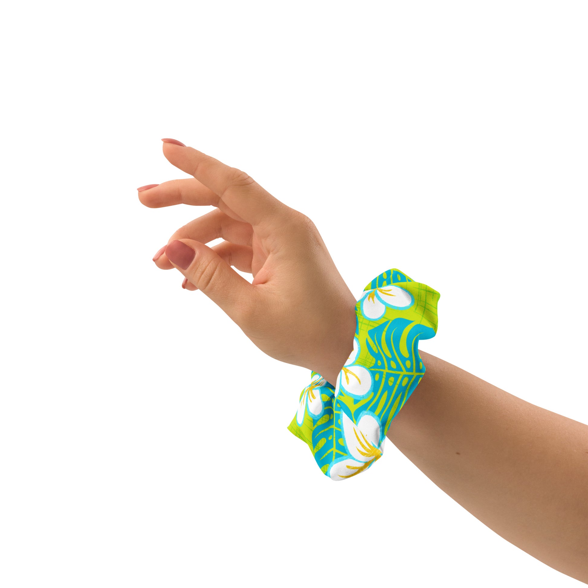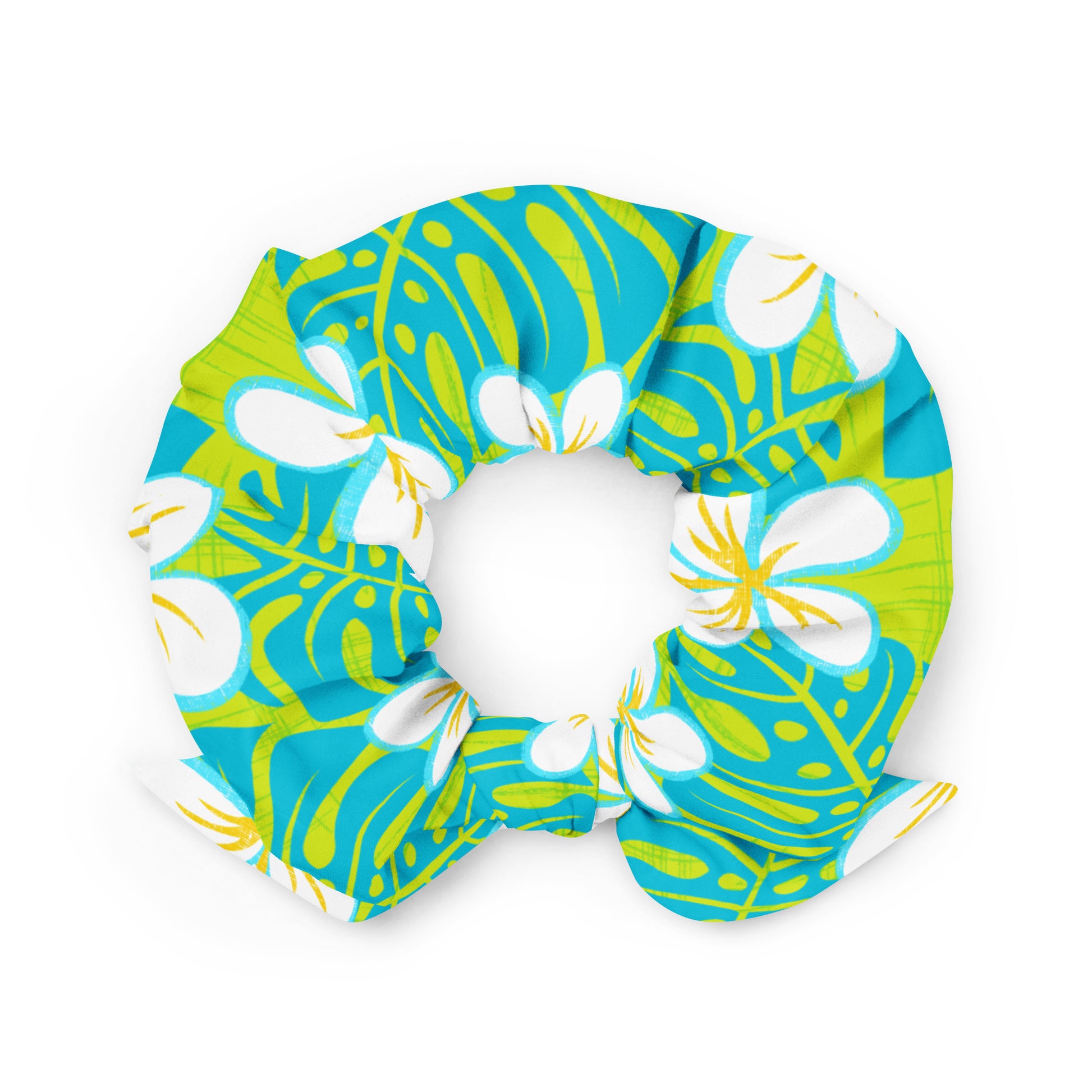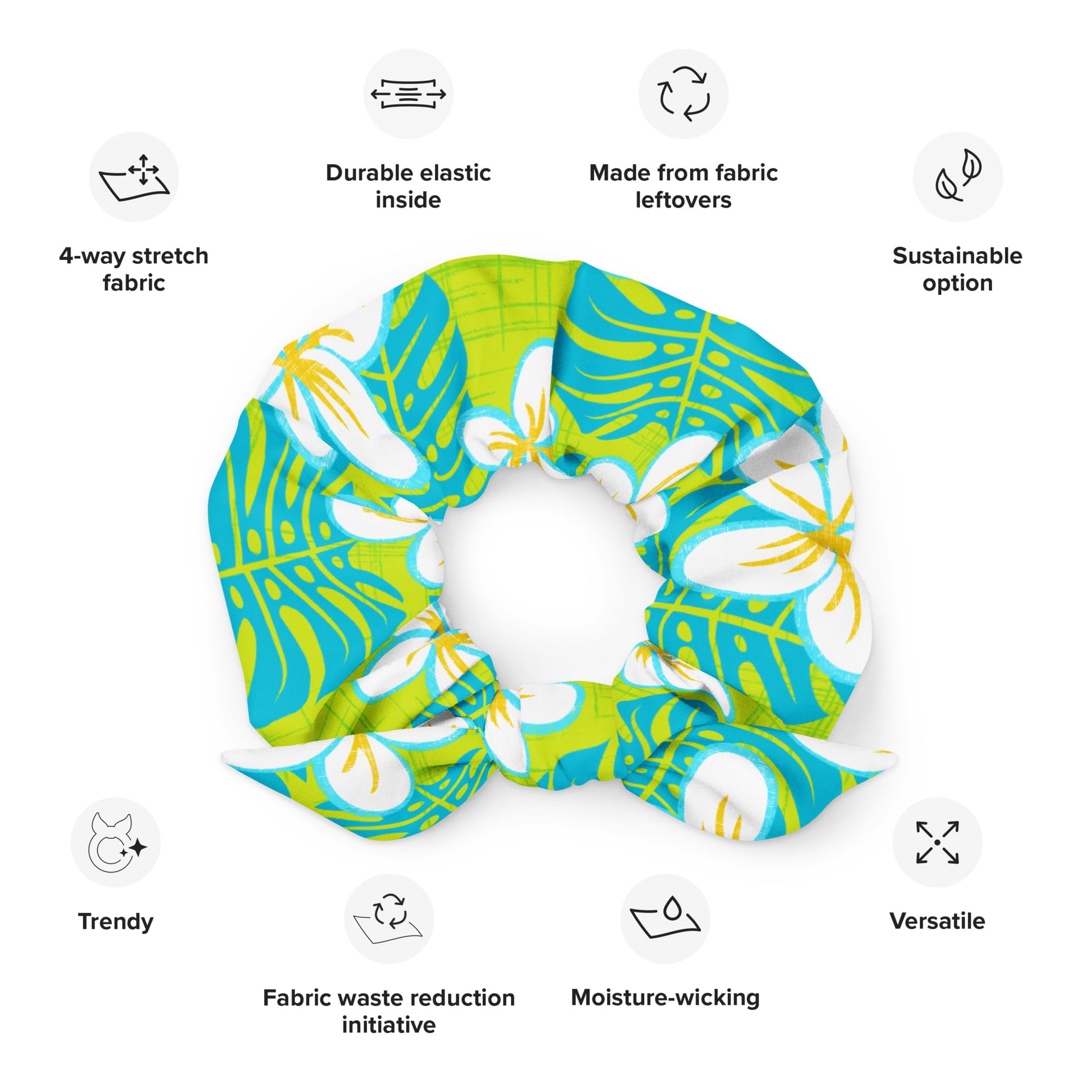 Dip into a Sour Blue Heaven with our recycled scrunchie! This tropical-flavored hair accessory features a blue and green pop, sure to make a statement. Put the "scrunch" in your wardrobe!