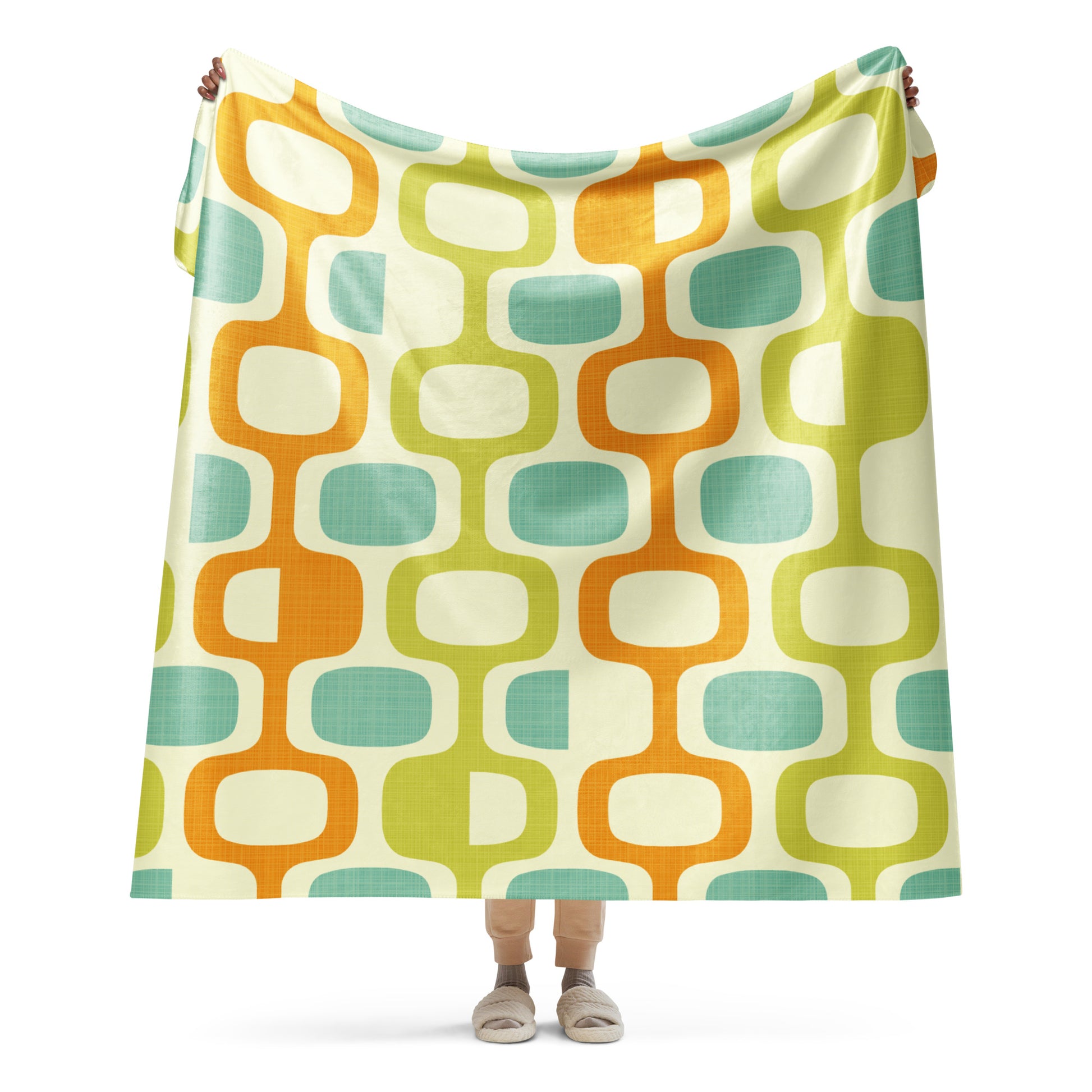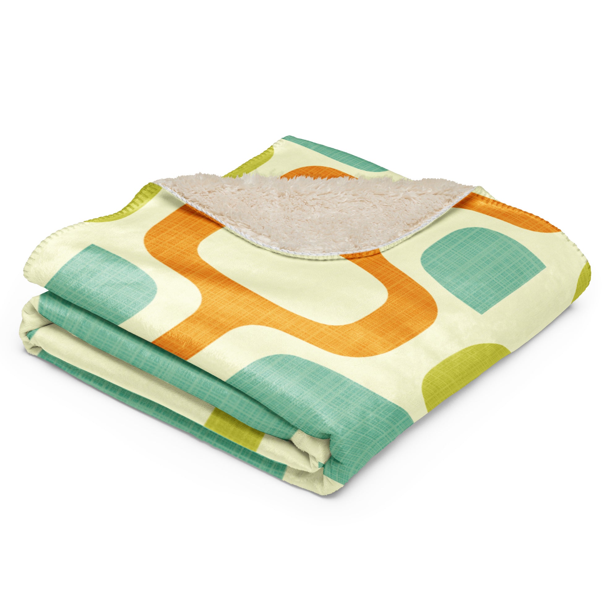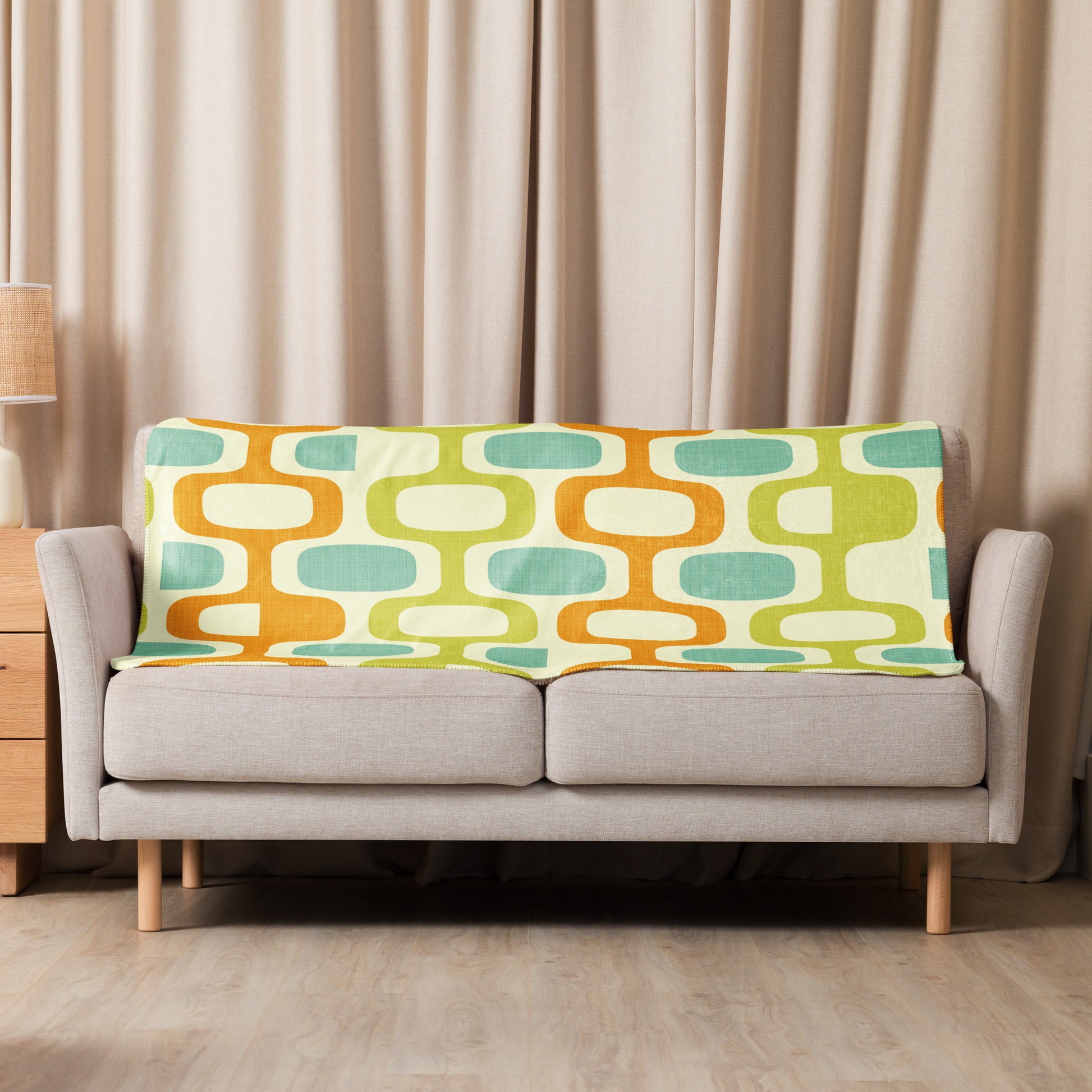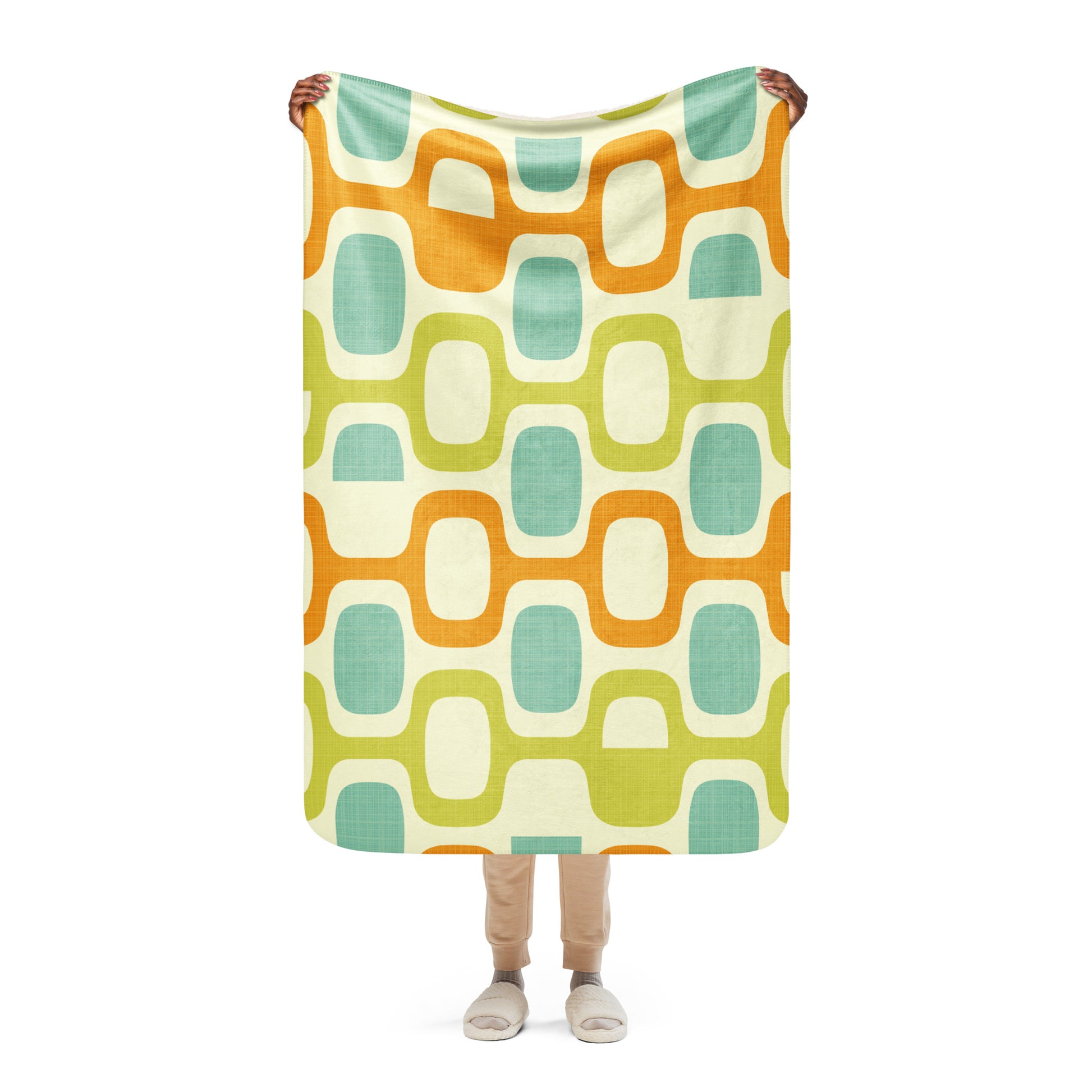 Stay warm and stylish with the Tangerine Kiwi Caruso Sherpa Blanket. Featuring mid century modern design and bright citrus colors, you can easily cozy up in style and comfort.