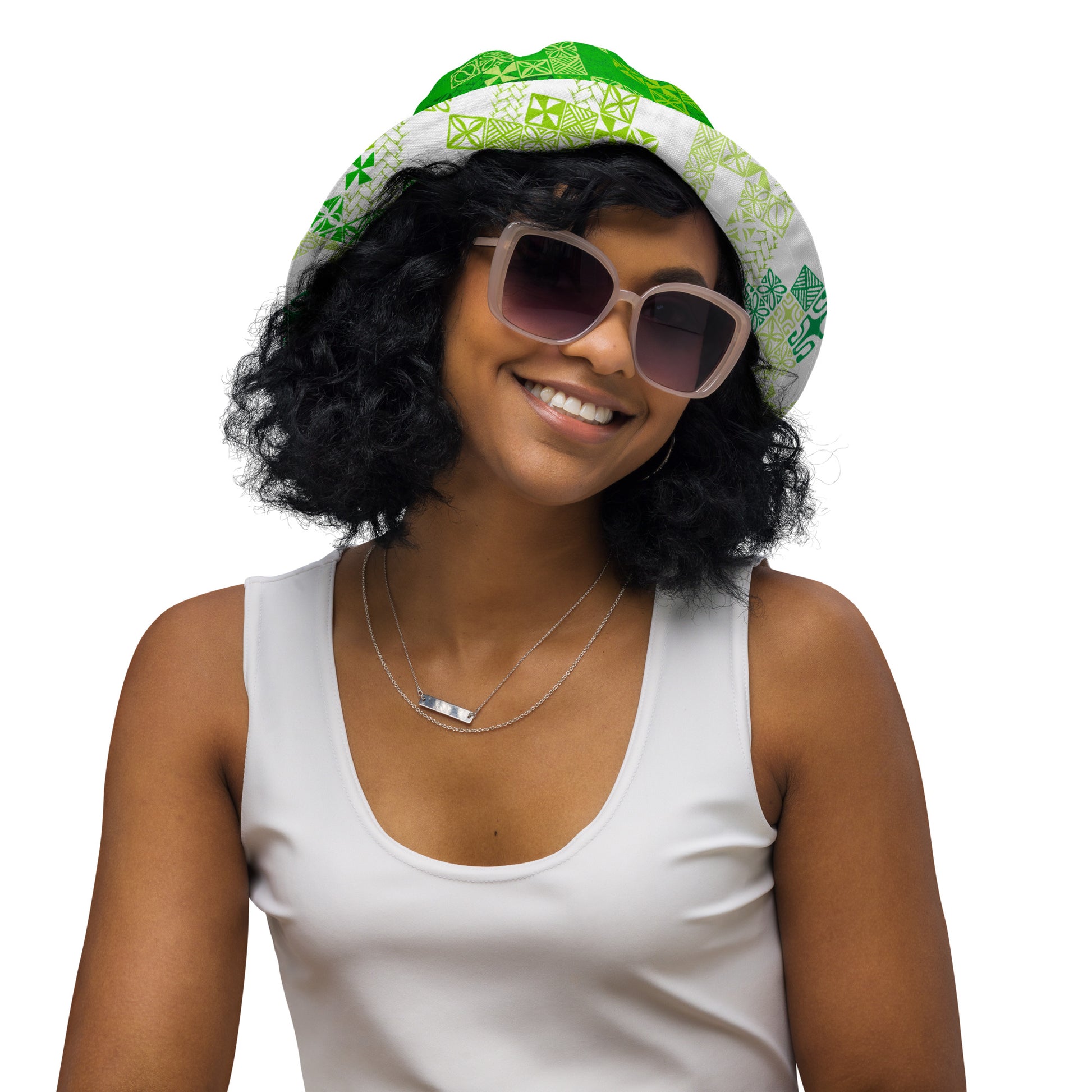 Discover an island-style look with our Tapa Tuesday Bucket Hat. This reversible hat brings a vibrant, tropic-inspired tapa design in shades of green, perfect for adding islander charm to any outfit.