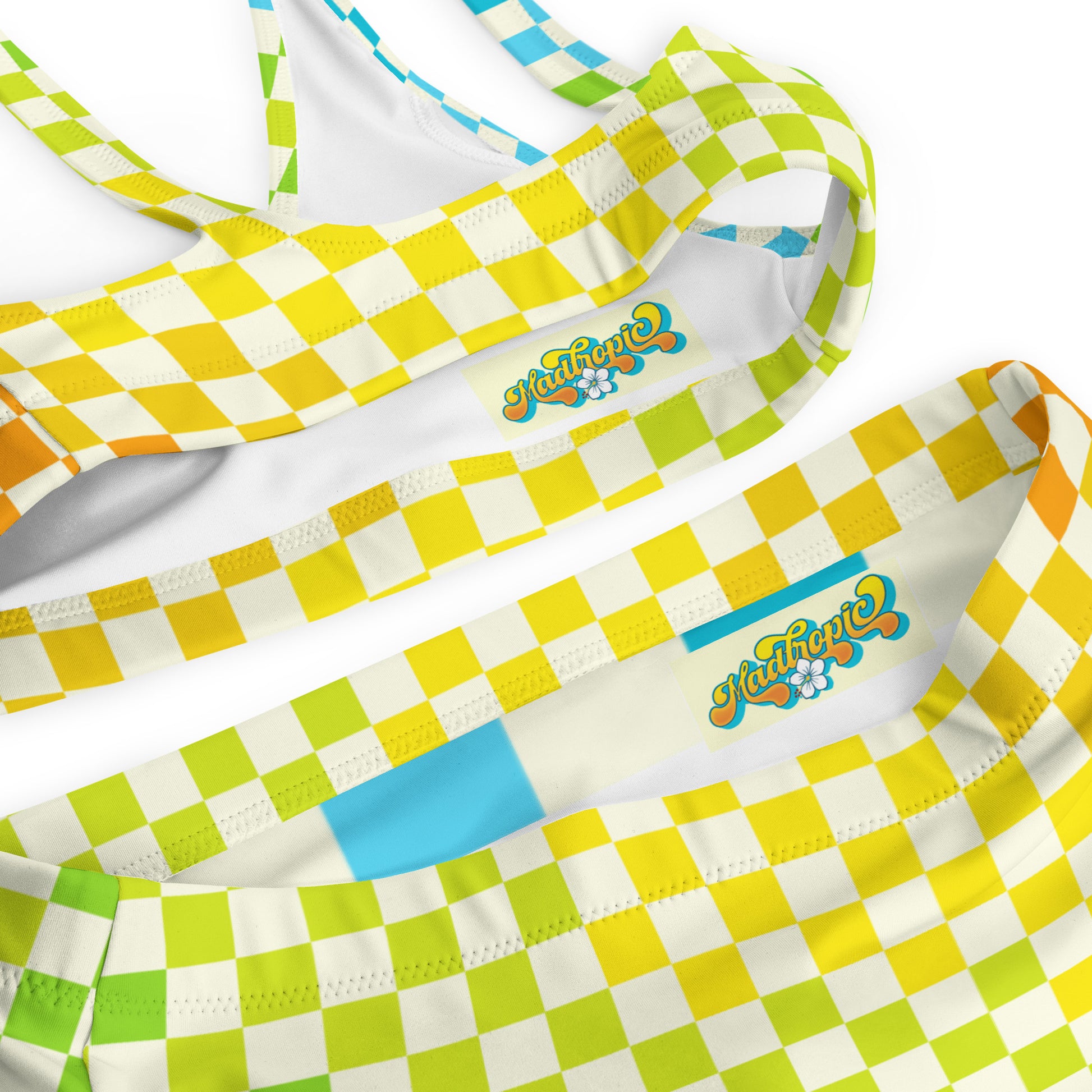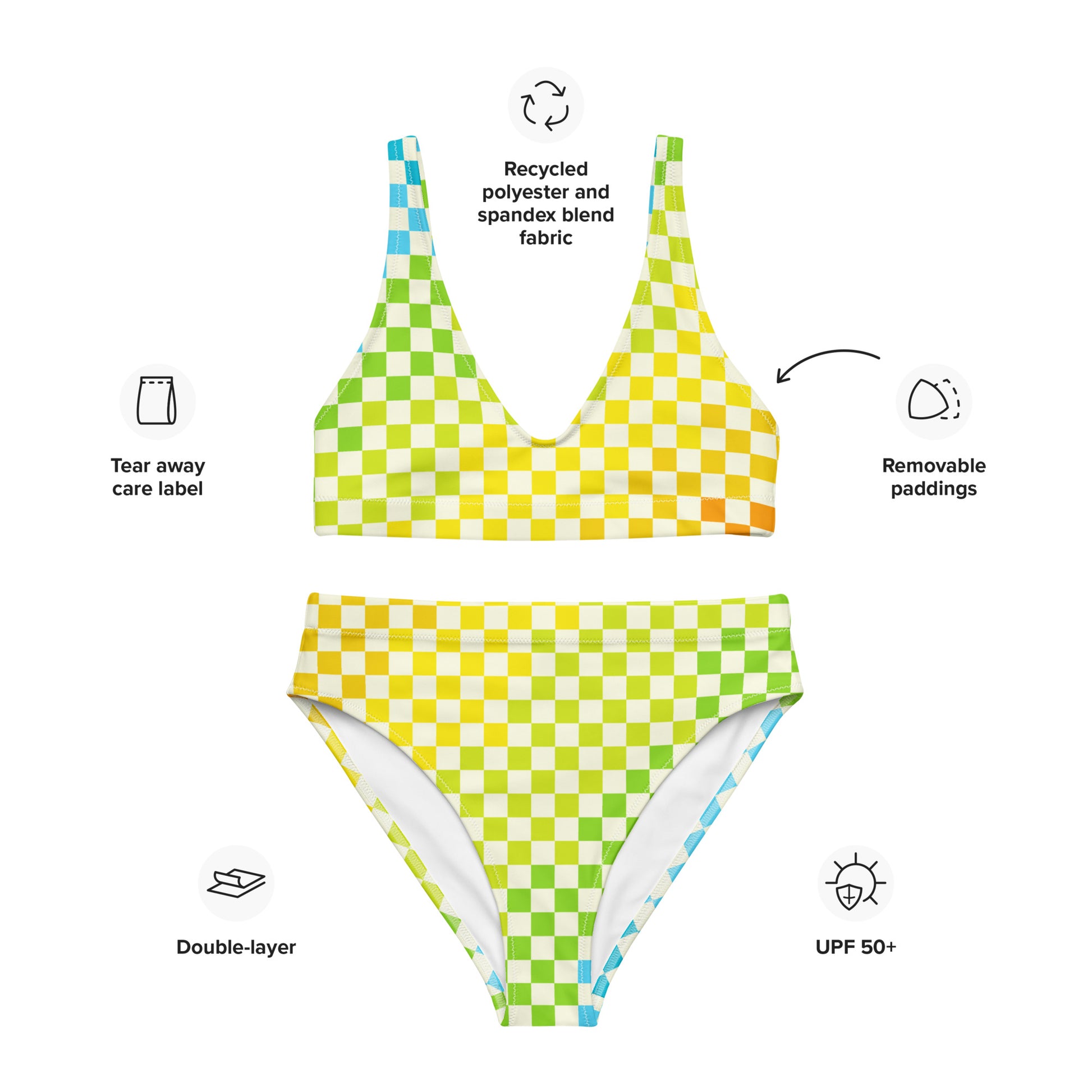 Make a splash with the Warm & Cool Check Recycled high-waisted bikini! Feel the summer vibes with this chic, colorful check pattern and make waves in a sustainable way since it's made of recycled materials. (Fun fact: checks always make a statement—but this one's extra special!)